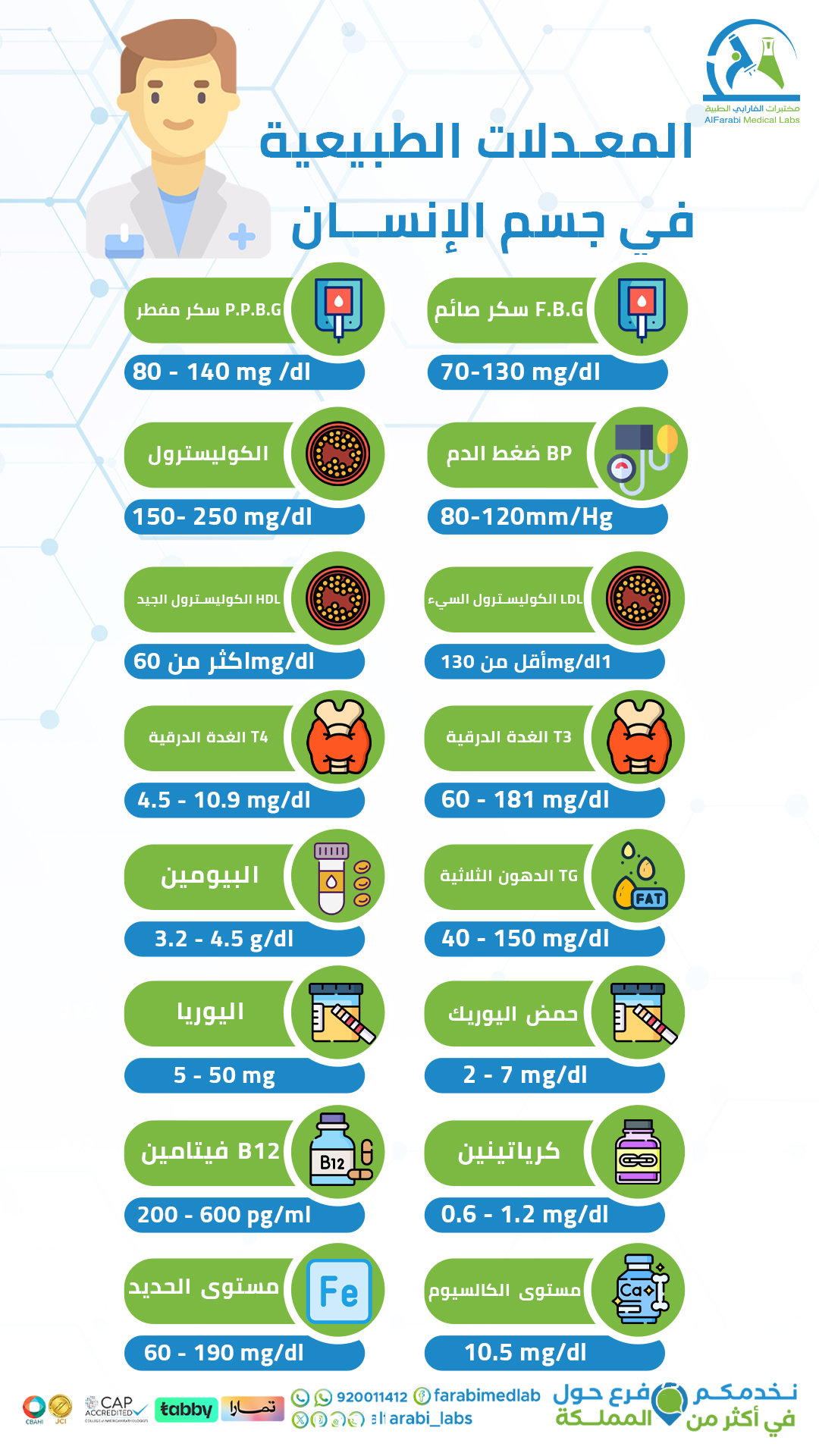 متابعة المعدلات الطبيعية لجسمك ليست رفاهية، لكنها خط الدفاع الأول للوقاية من الأمراض المزمنة. اجراء فحوصاتك بشكل دوري في مختبرات الفارابي واطمّن على صحتك.