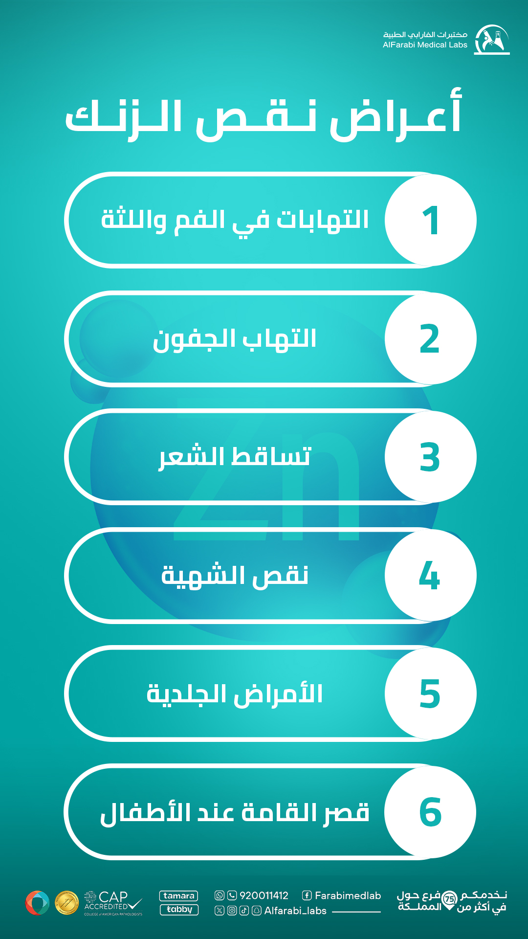 ظهور أعراض نقص الزنك لا يعني الاعتماد فقط على التوقعات، بل يحتاج إلى تحاليل دقيقة للتأكد من مستويات الزنك في الدم. في مختبراتنا نوفر فحوصات شاملة تساعدك على الاطمئنان على صحتك والكشف المبكر عن أي نقص في المعادن والفيتامينات، مما يساهم في تجنب المضاعفات وعلاج المشكلة من جذورها.
