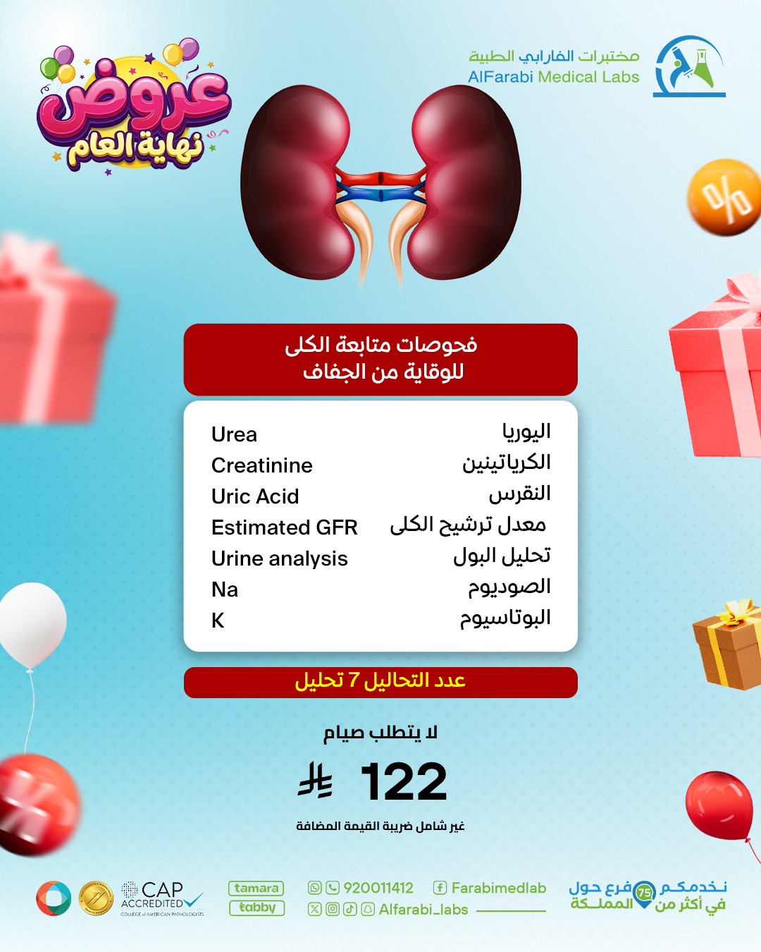 تهدف هذه الباقة إلى تقييم وظائف الكلى بدقة والكشف المبكر عن أي خلل قد يؤدي إلى الجفاف، تراكم الأملاح، أو ارتفاع حمض اليوريك. تعد مناسبة لمن يعاني من ارتفاع الضغط، داء السكري، استخدام أدوية مدرة للبول، أو أي عوامل قد تؤثر على الكلى.