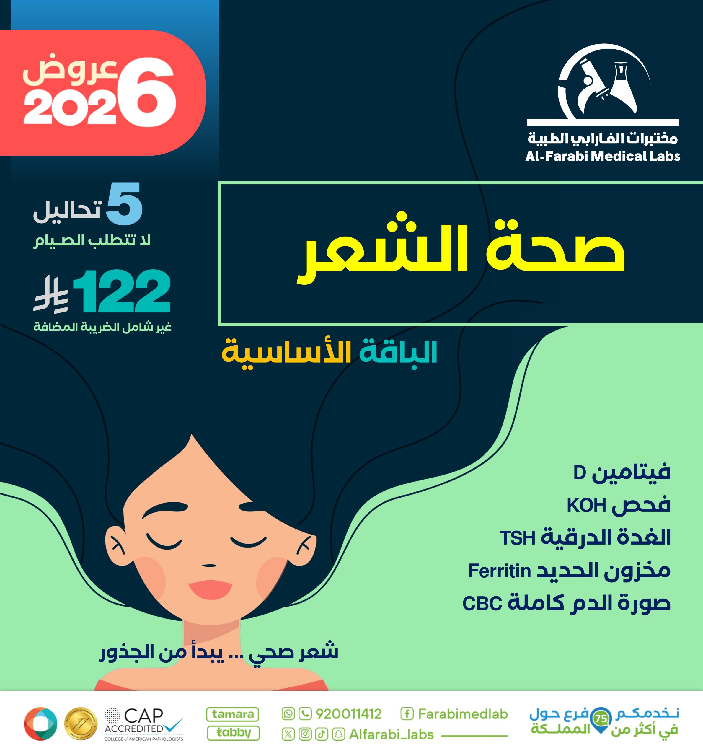 احتفل برمضان مع باقة صحة الشعر من مختبرات الفارابي الطبية، واطمئن على صحة فروة رأسك وشعرك من الجذور. هذه الباقة مصممة لتقييم صحة الشعر والكشف المبكر عن أي مشاكل تتعلق بالفيتامينات أو الحديد أو الغدة الدرقية، لتتمتع بشعر صحي وكثيف.
