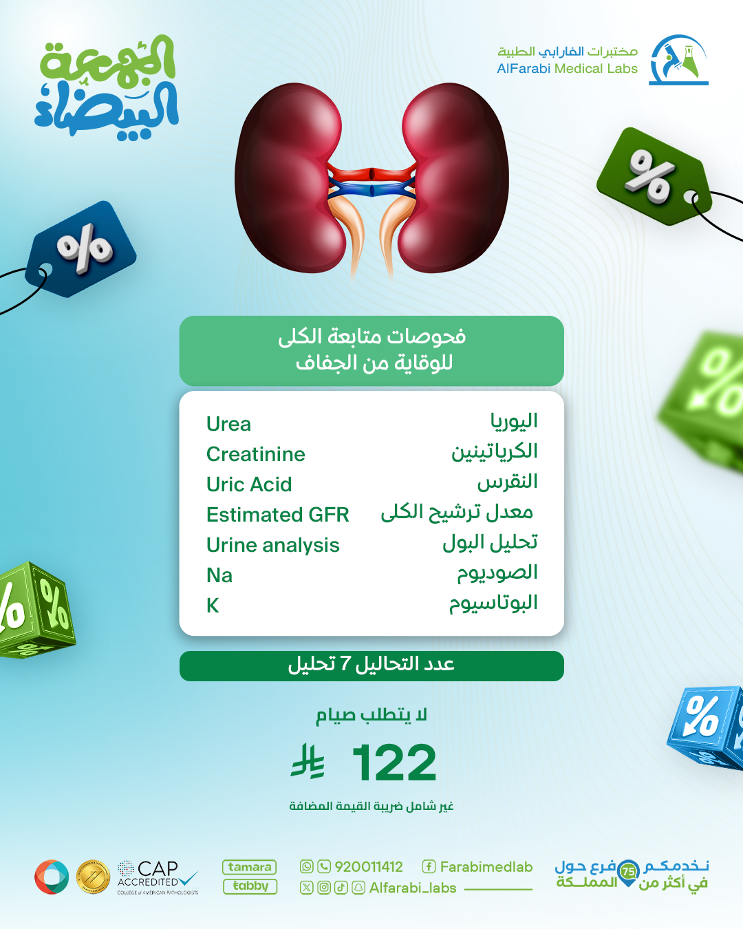 تهدف هذه الباقة إلى تقييم وظائف الكلى بدقة والكشف المبكر عن أي خلل قد يؤدي إلى الجفاف، تراكم الأملاح، أو ارتفاع حمض اليوريك. تعد مناسبة لمن يعاني من ارتفاع الضغط، داء السكري، استخدام أدوية مدرة للبول، أو أي عوامل قد تؤثر على الكلى.