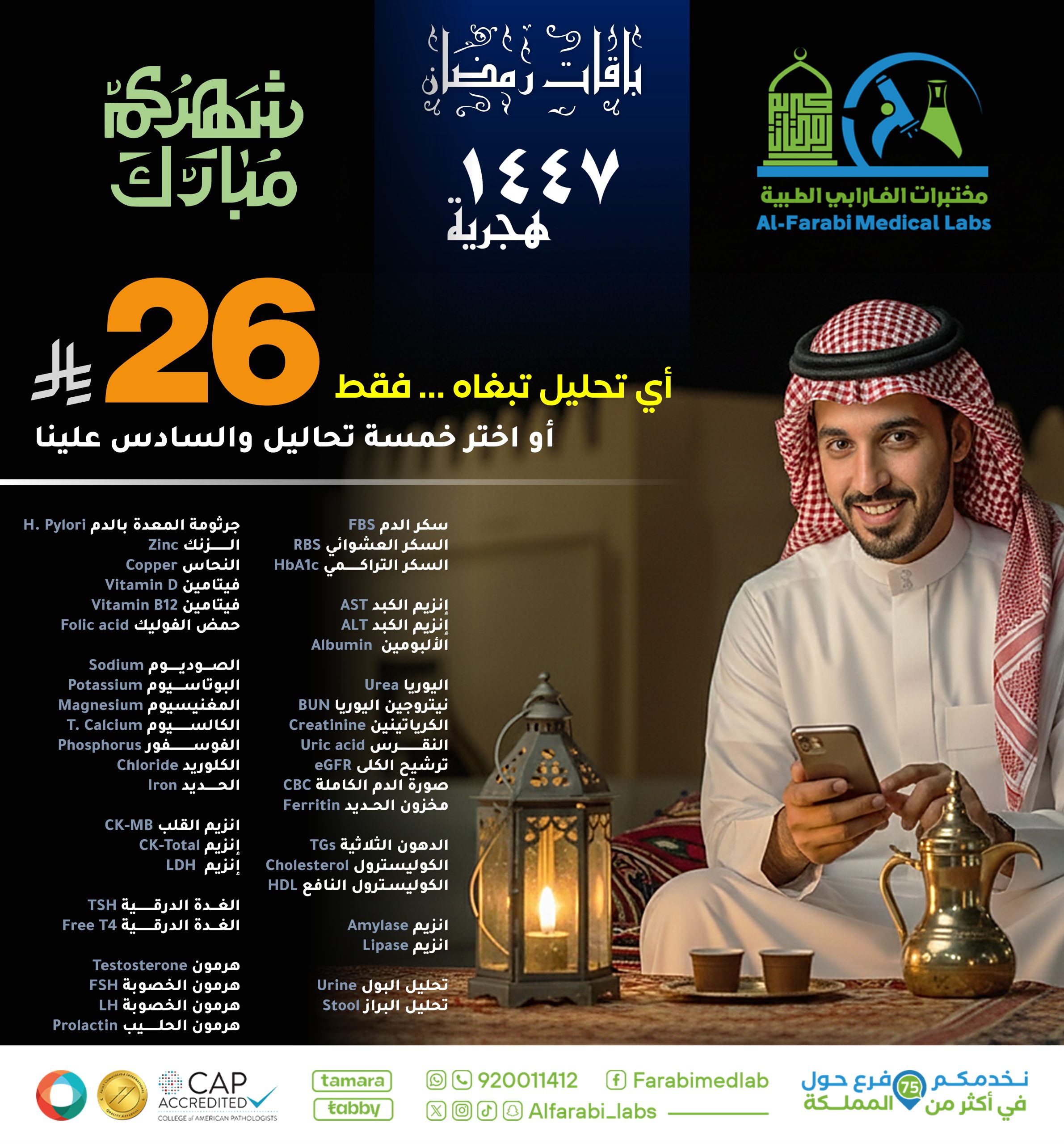 تقدّم مختبرات الفارابي الطبية عرضًا استثنائيًا بمناسبة شهر رمضان الكريم، يتيح لك إجراء أي تحليل من قائمة مختارة من أهم التحاليل الطبية بسعر خاص جدًا.