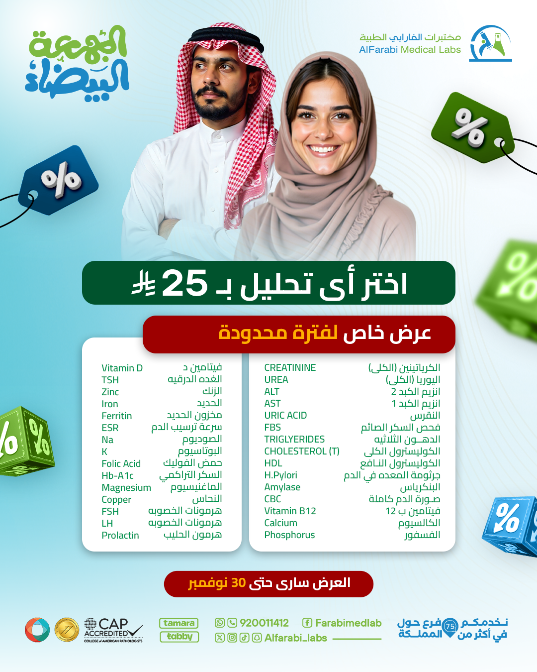 قائمة التحاليل المتاحة بسعر 25 ريال:
