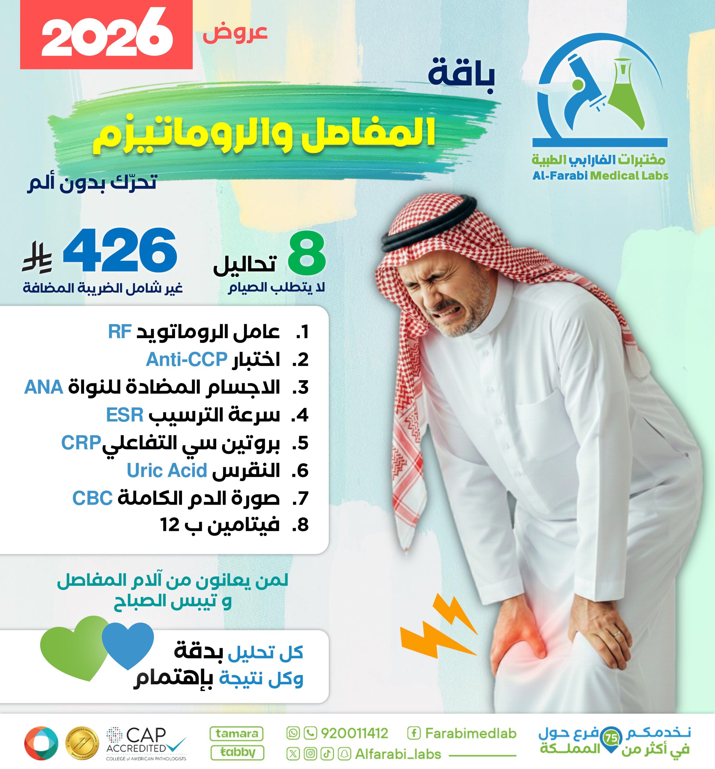 حافظ على صحة مفاصلك وتحرك بدون ألم مع باقة المفاصل والروماتيزم من مختبرات الفارابي الطبية، التي تضم 8 تحاليل دقيقة لا تتطلب الصيام. هذه الباقة مثالية لمن يعانون من آلام المفاصل أو تيبس الصباح، لتقييم أسباب الألم واكتشاف أي مشاكل روماتيزمية أو نقص في الفيتامينات الضرورية.