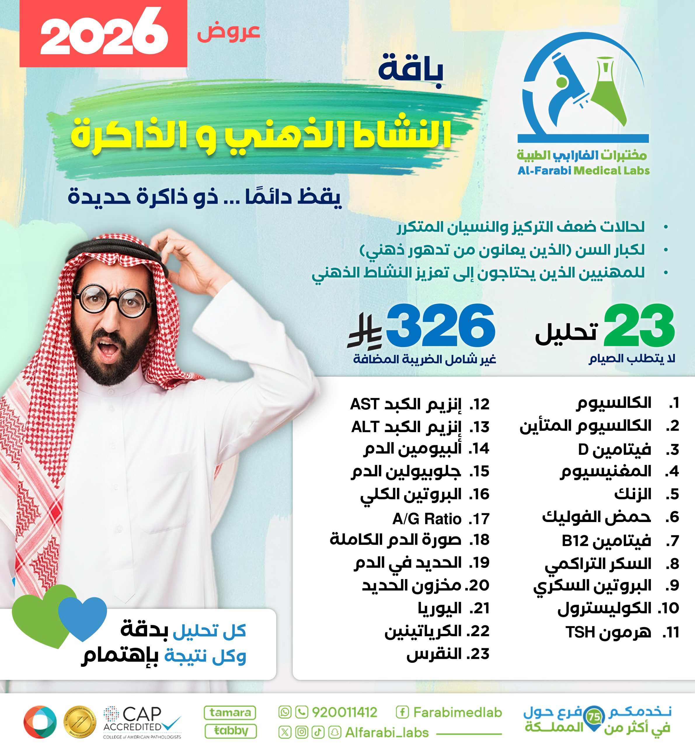 حافظ على نشاطك الذهني وذاكرتك حادة دائمًا. هذه الباقة مخصصة لكبار السن الذين يعانون من ضعف التركيز أو التدهور الذهني، وللمهنيين الراغبين في تعزيز الأداء العقلي والذاكرة. لا تتطلب الباقة الصيام وتشمل 23 تحليلًا دقيقًا لتقييم صحة الجسم ودعم الوظائف الذهنية.