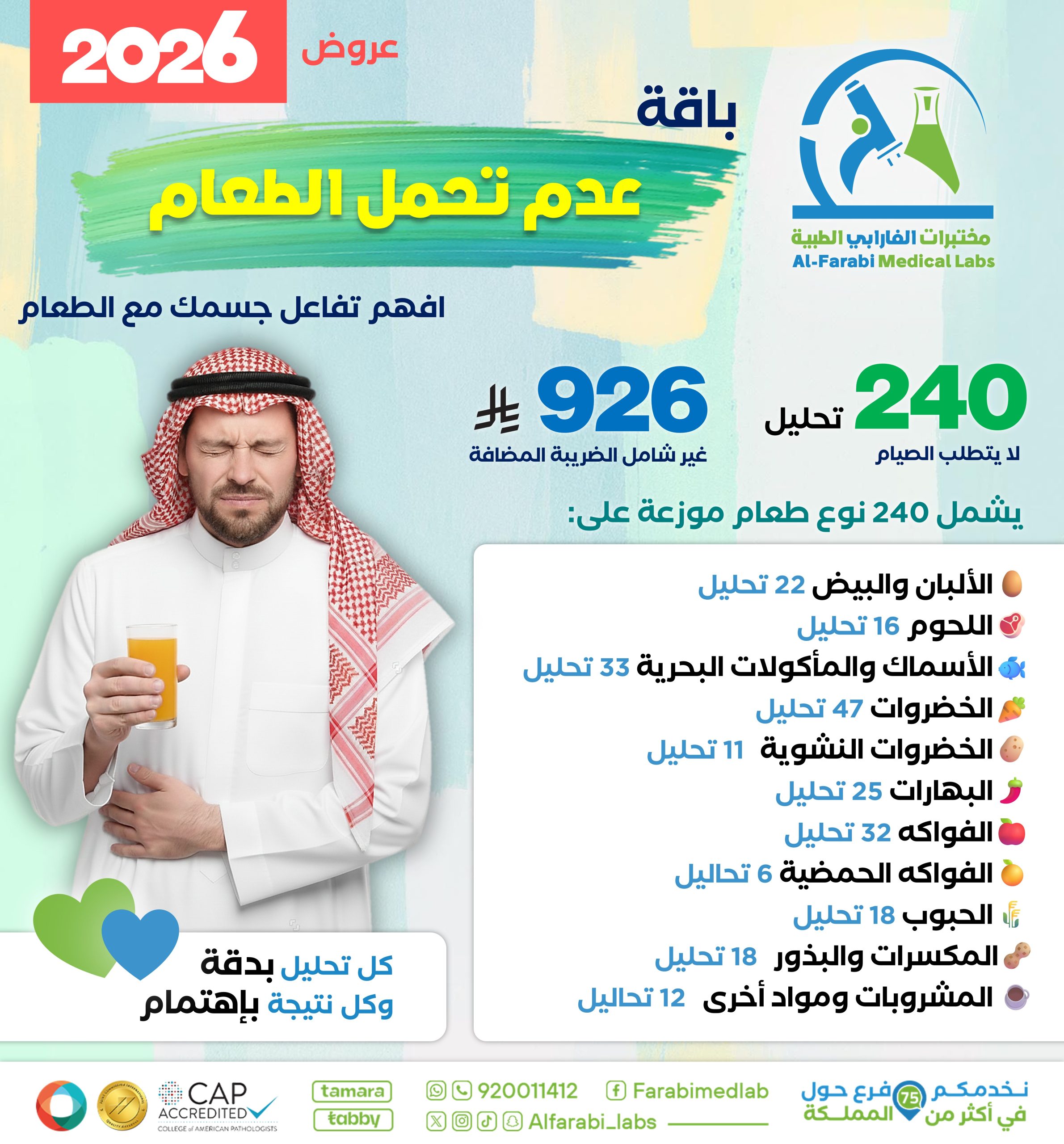 افهم تفاعل جسمك مع الطعام مع باقة عدم تحمل الطعام من مختبرات الفارابي الطبية، التي تشمل 240 تحليلًا دقيقًا لتقييم استجابة الجسم لمجموعة واسعة من الأطعمة المختلفة. الباقة لا تتطلب الصيام وتساعد على اكتشاف الأطعمة التي قد تسبب حساسية أو اضطرابات هضمية، مما يساهم في تحسين صحتك العامة وجودة حياتك.