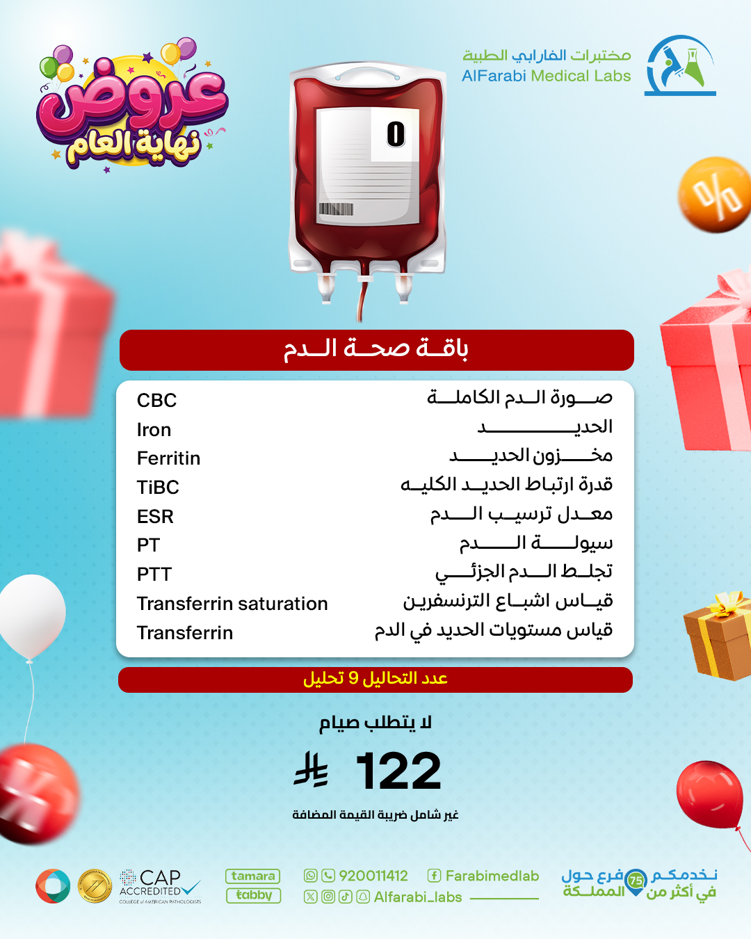 تُقدّم مختبرات الفارابي الطبية باقة متكاملة لفحص صحة الدم ووظائفه الأساسية، لتقييم مستويات الحديد ومخزونه، بالإضافة إلى فحوصات السيولة الدموية لضمان صحة القلب والأوعية الدموية.