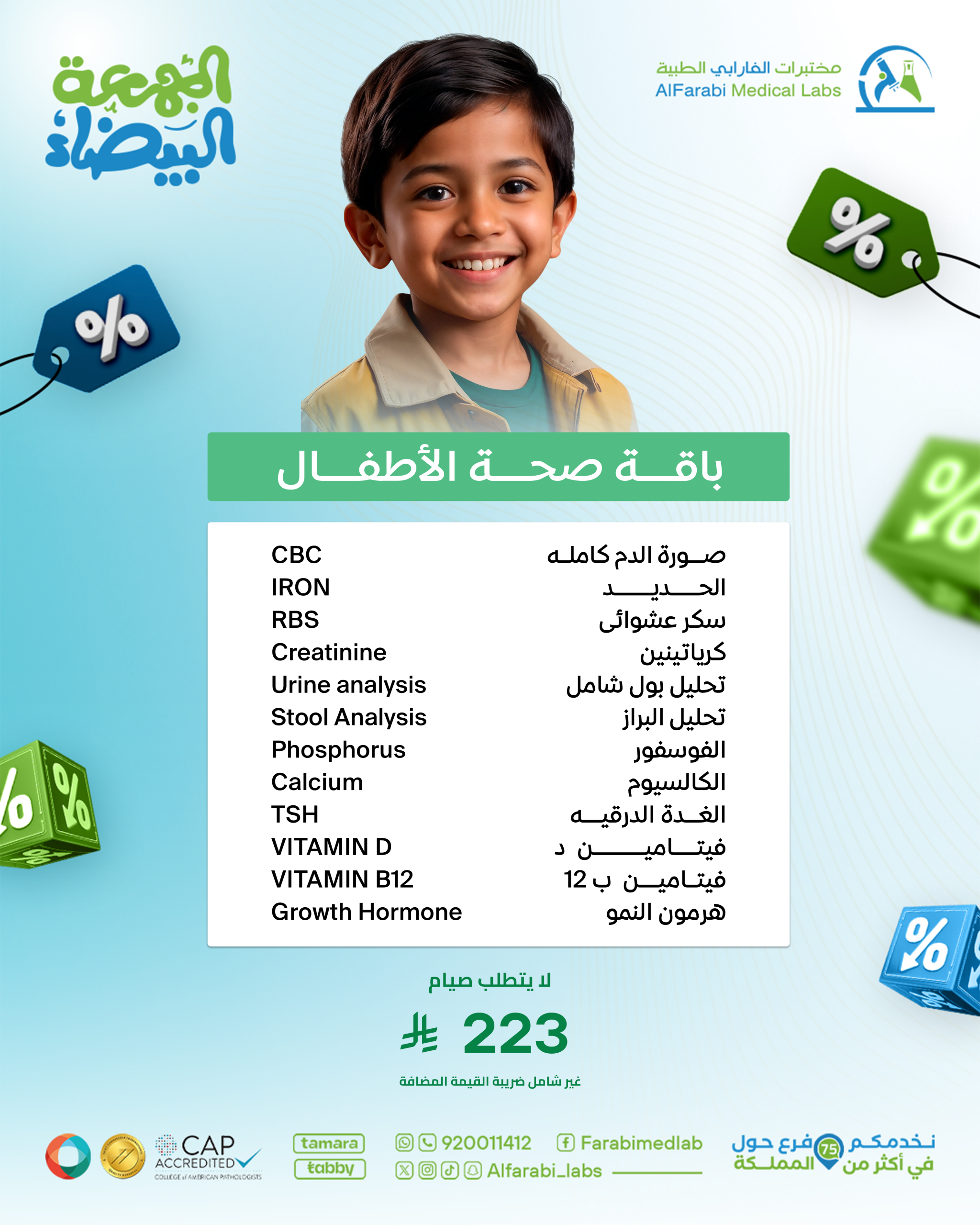 تُعد باقة صحة الأطفال – الجمعة البيضاء خيارًا متكاملاً لمتابعة صحة الطفل ونموه، مع التركيز على الدم، الكلى، الكبد، الغدة الدرقية، الفيتامينات، المعادن، والهرمونات المهمة لنمو الجسم.