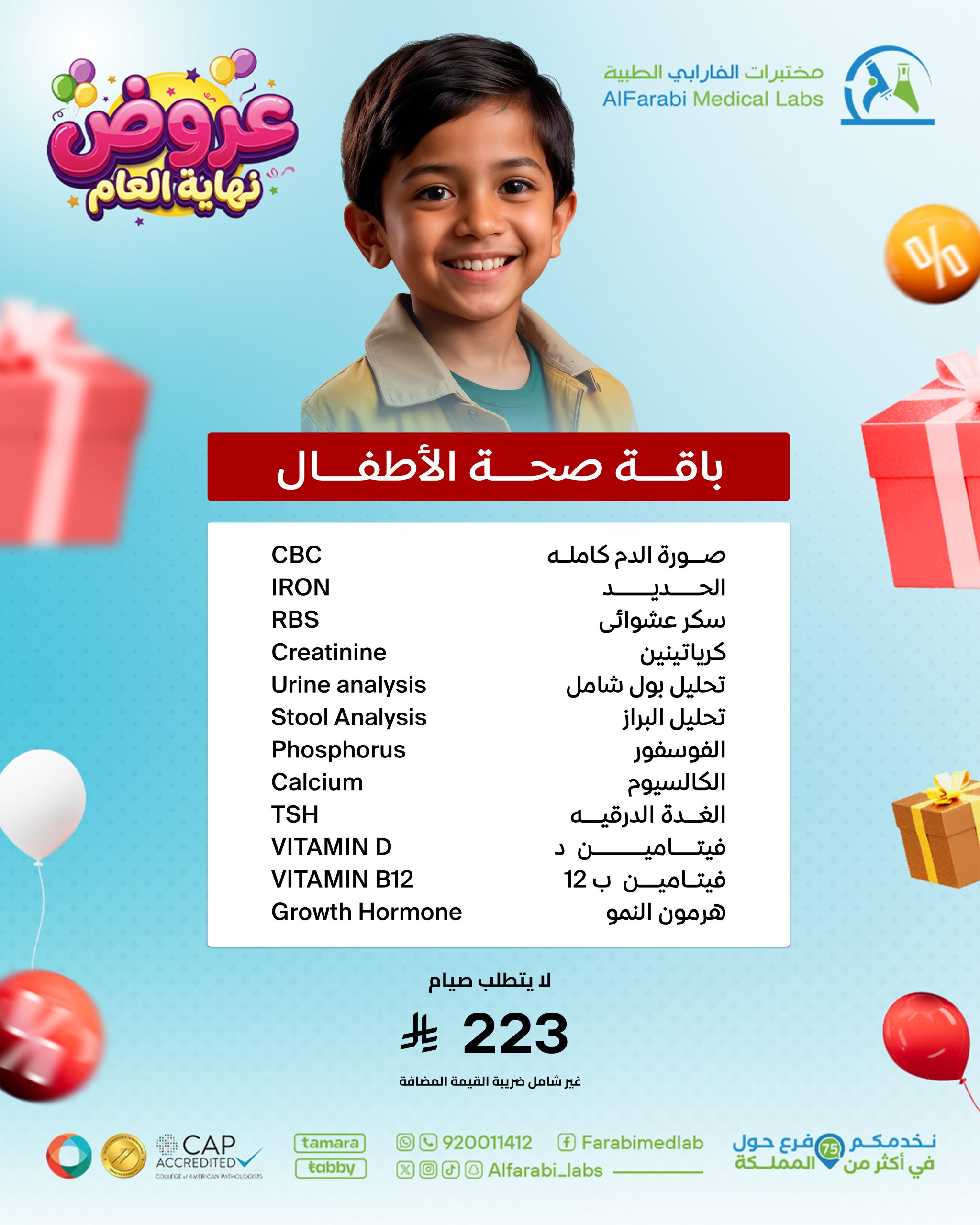 تُعد باقة صحة الأطفال – الجمعة البيضاء خيارًا متكاملاً لمتابعة صحة الطفل ونموه، مع التركيز على الدم، الكلى، الكبد، الغدة الدرقية، الفيتامينات، المعادن، والهرمونات المهمة لنمو الجسم.