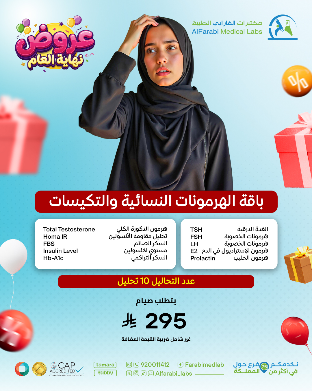 تقدّم مختبرات الفارابي الطبية باقة شاملة لفحص الهرمونات النسائية والتكيسات، لمتابعة صحة الغدة الدرقية، هرمونات الخصوبة، مقاومة الأنسولين، ومستوى السكر في الدم، بما يساهم في التشخيص المبكر للاضطرابات الهرمونية ومراقبة التكيسات.