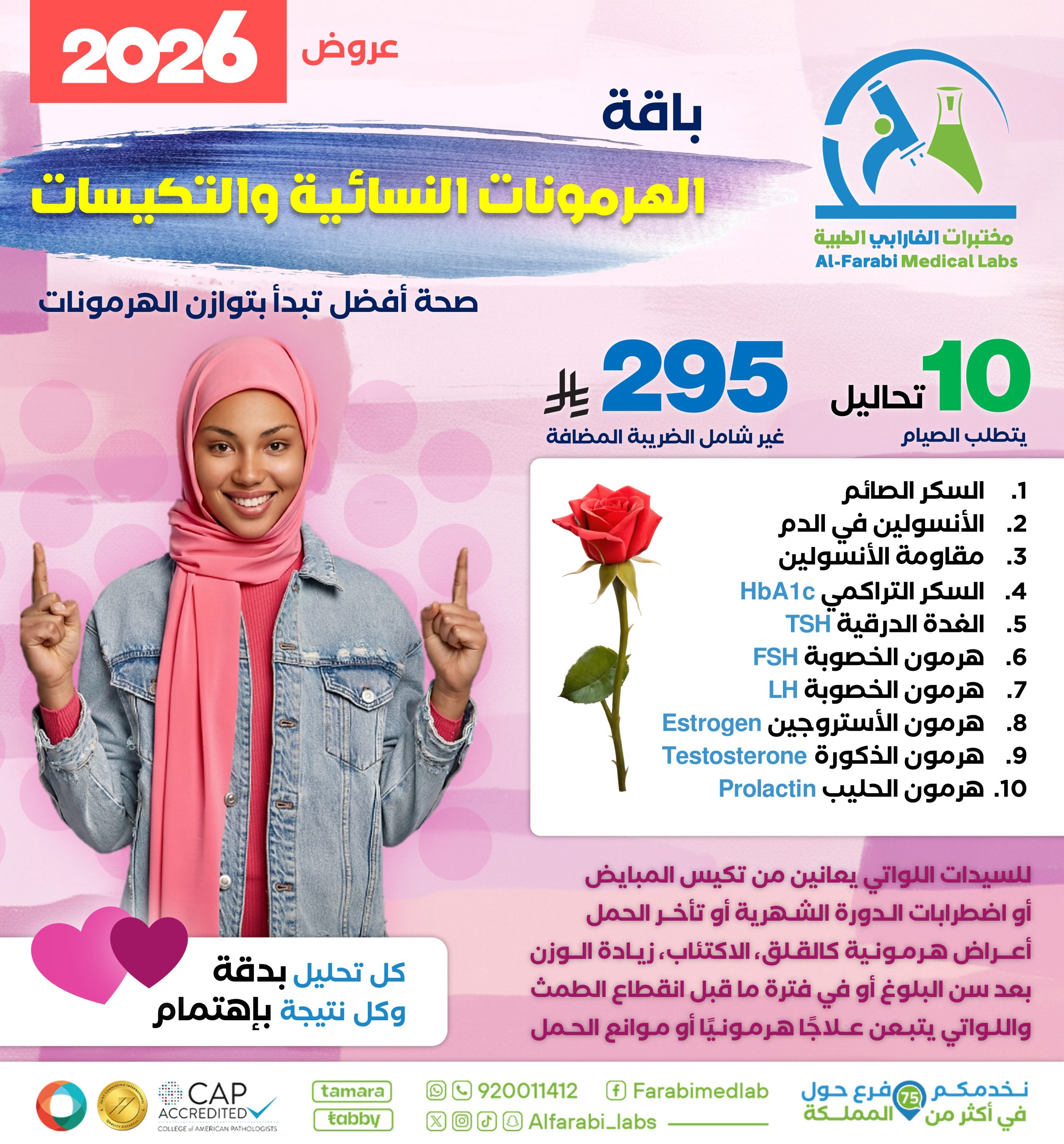 ابدأي رحلة صحة أفضل بتوازن الهرمونات مع باقة الهرمونات النسائية والتكيسات من مختبرات الفارابي الطبية، التي تضم 10 تحاليل دقيقة تتطلب الصيام. الباقة مخصصة للسيدات اللواتي يعانين من تكيس المبايض، اضطرابات الدورة الشهرية، تأخر الحمل، أو الأعراض الهرمونية مثل القلق، الاكتئاب، وزيادة الوزن بعد سن البلوغ أو في فترة ما قبل انقطاع الطمث، وأيضًا لمن يتبعن علاجًا هرمونيًا أو موانع الحمل.