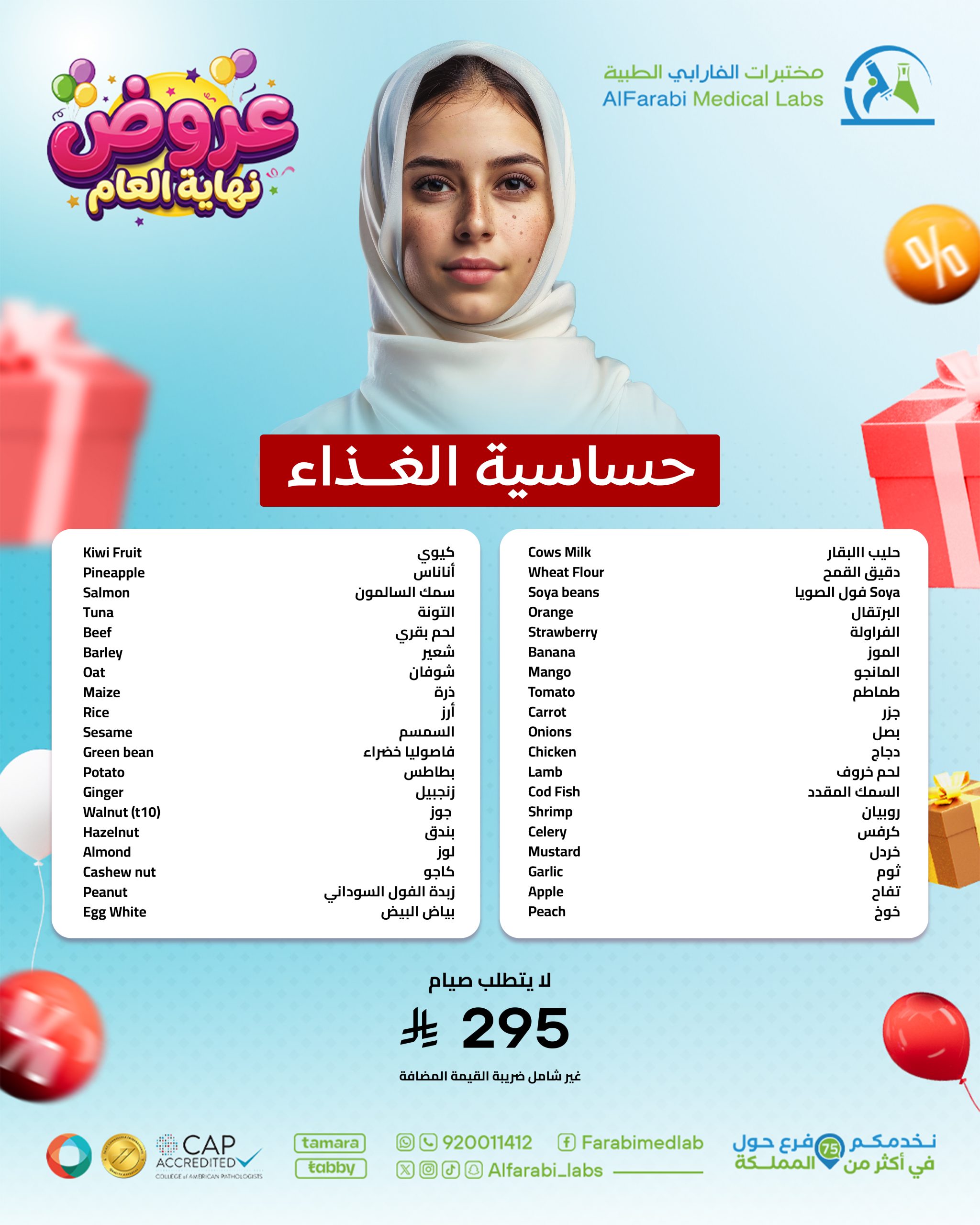 تقدّم مختبرات الفارابي الطبية باقة متكاملة لفحص حساسية الغذاء، لتحديد مسببات الحساسية من الأطعمة الشائعة والحبوب والمكسرات والمنتجات البحرية، بما يساهم في الحفاظ على صحتك وتجنب أي مضاعفات صحية.