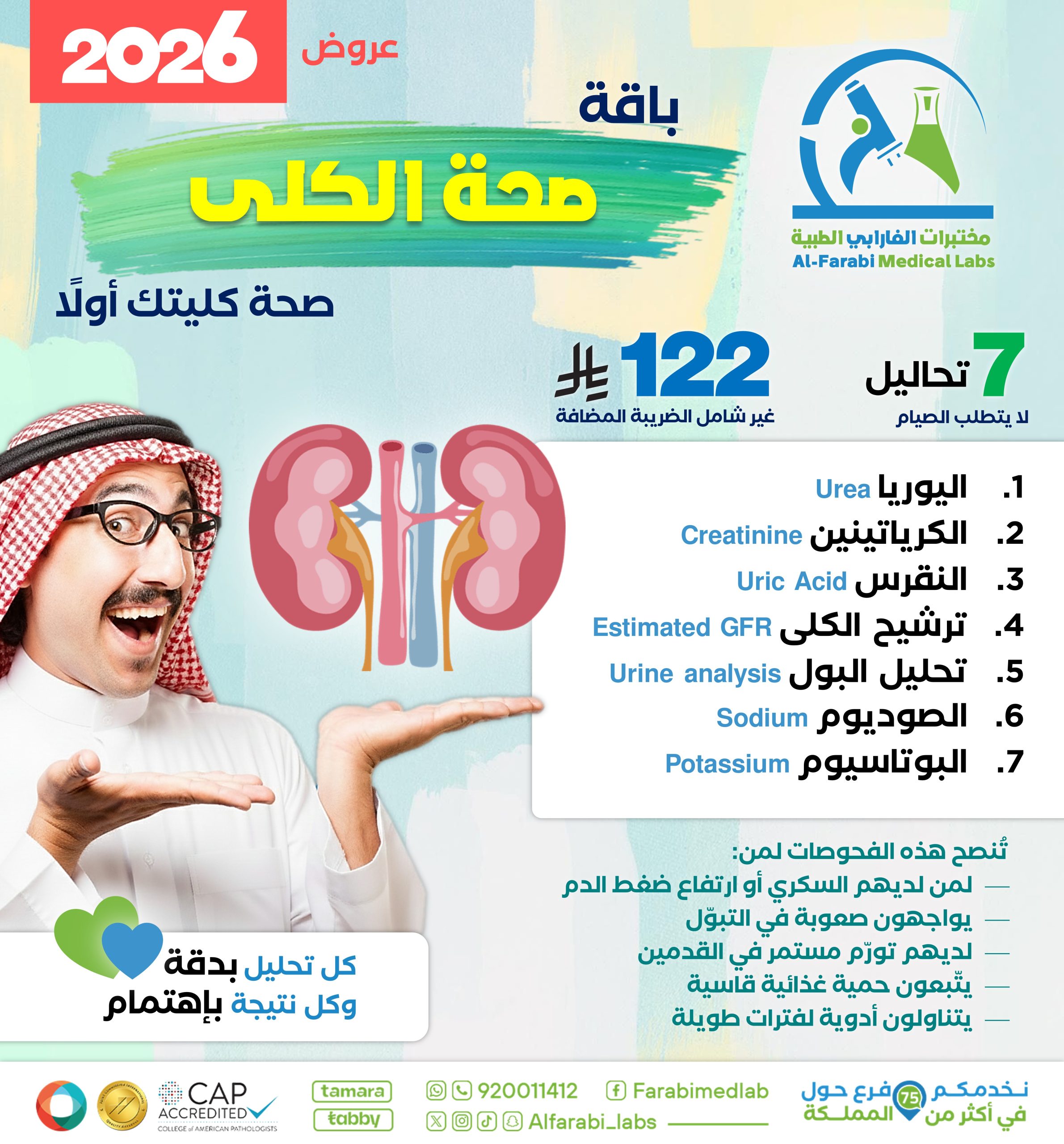 حافظ على صحة كليتك مع باقة صحة الكلى من مختبرات الفارابي الطبية، التي تشمل 7 تحاليل دقيقة لا تتطلب الصيام، وتساعد في الكشف المبكر عن أي مشكلات في وظائف الكلى والكهارل، خاصة لمن لديهم السكري، ارتفاع ضغط الدم، أو يتناولون أدوية لفترات طويلة.