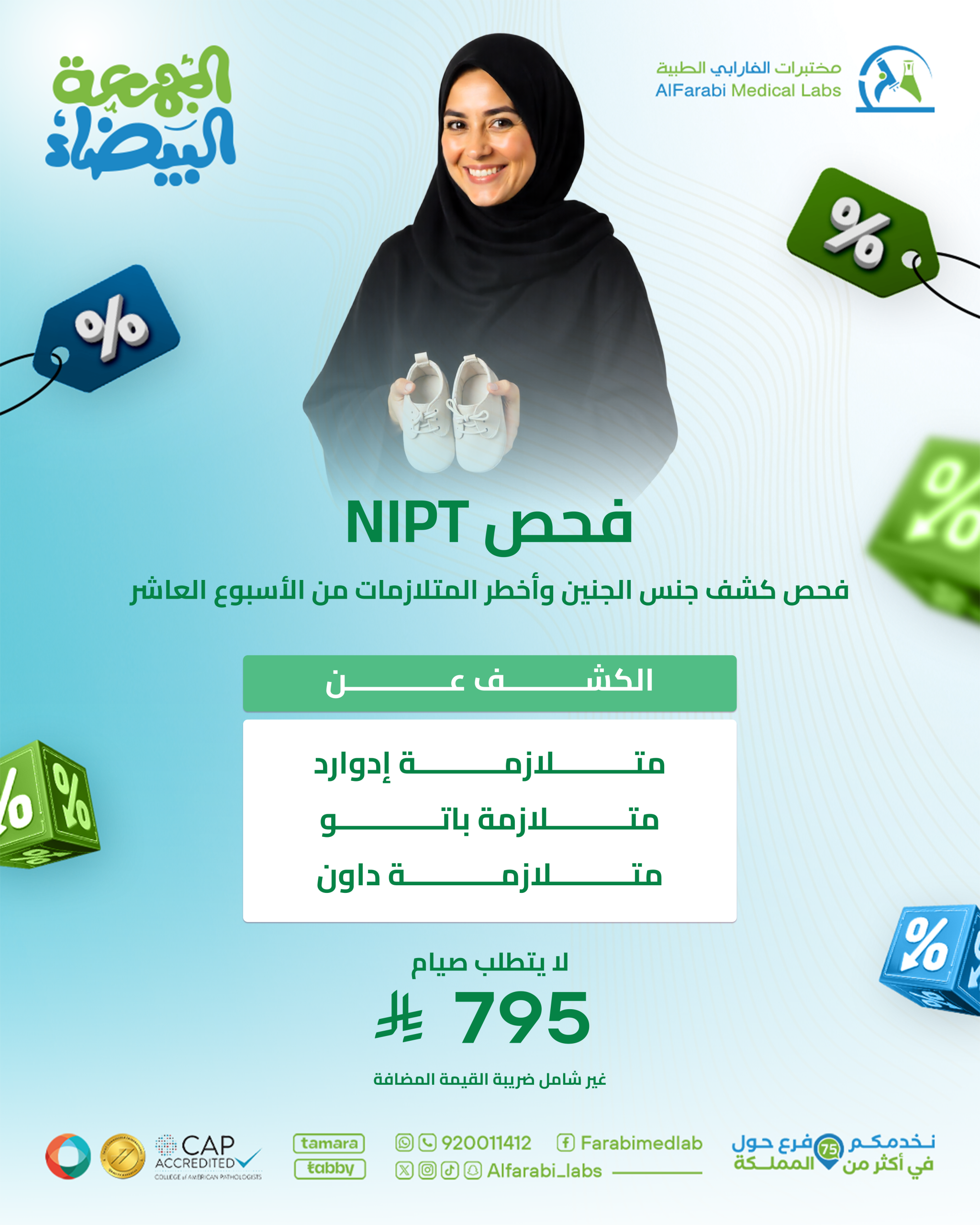تُعد باقة فحص NIPT – الجمعة البيضاء الخيار الأمثل للأمهات اللواتي يرغبن في متابعة صحة الجنين واكتشاف أي متلازمات محتملة منذ الأسبوع العاشر من الحمل.