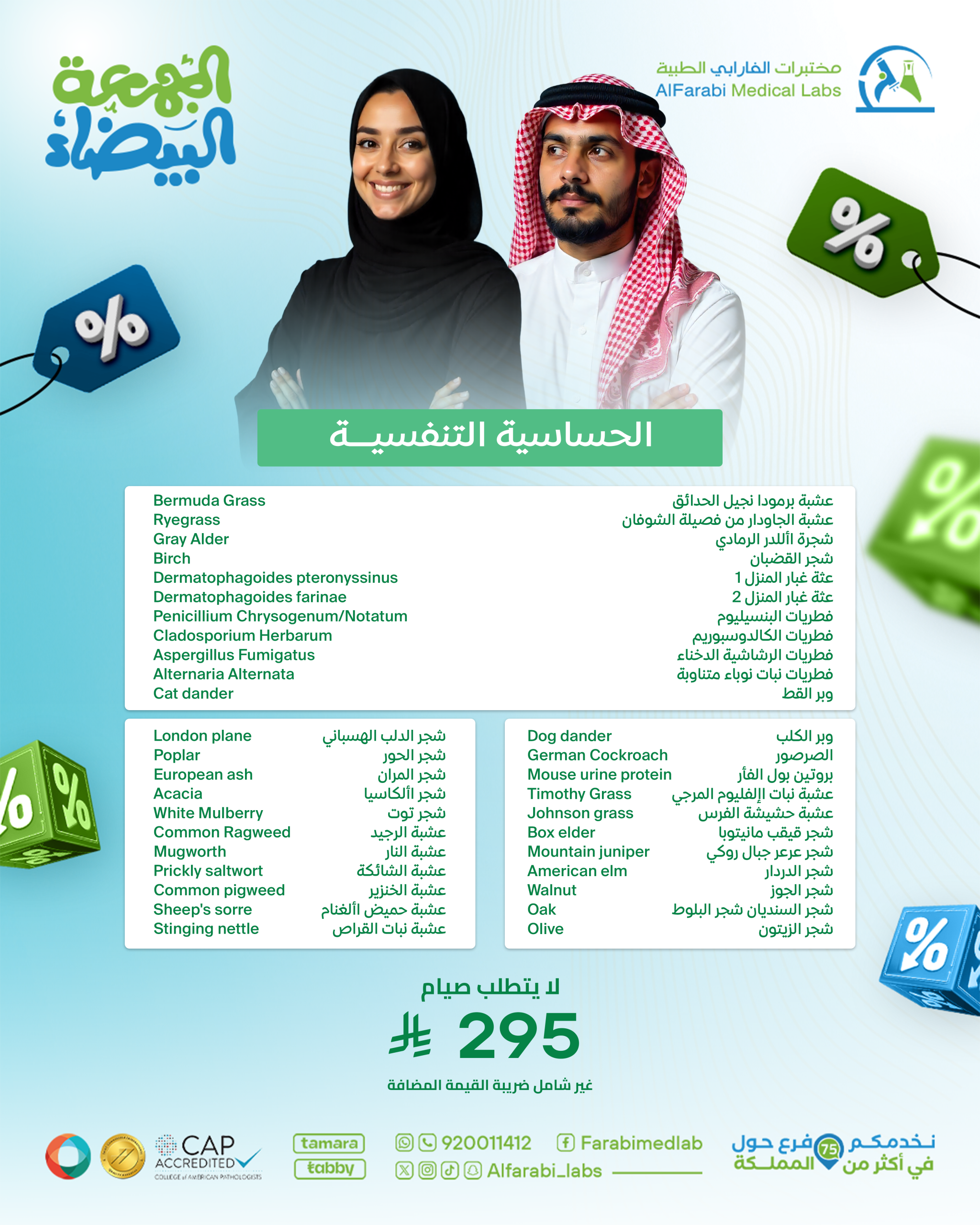 تقدّم مختبرات الفارابي الطبية باقة شاملة لفحص الحساسية التنفسية، لتحديد مسببات الحساسية من الأعشاب، الأشجار، الغبار، الفطريات، وبر الحيوانات، والحشرات، بما يساهم في الوقاية من الأعراض التنفسية والحساسية الموسمية.