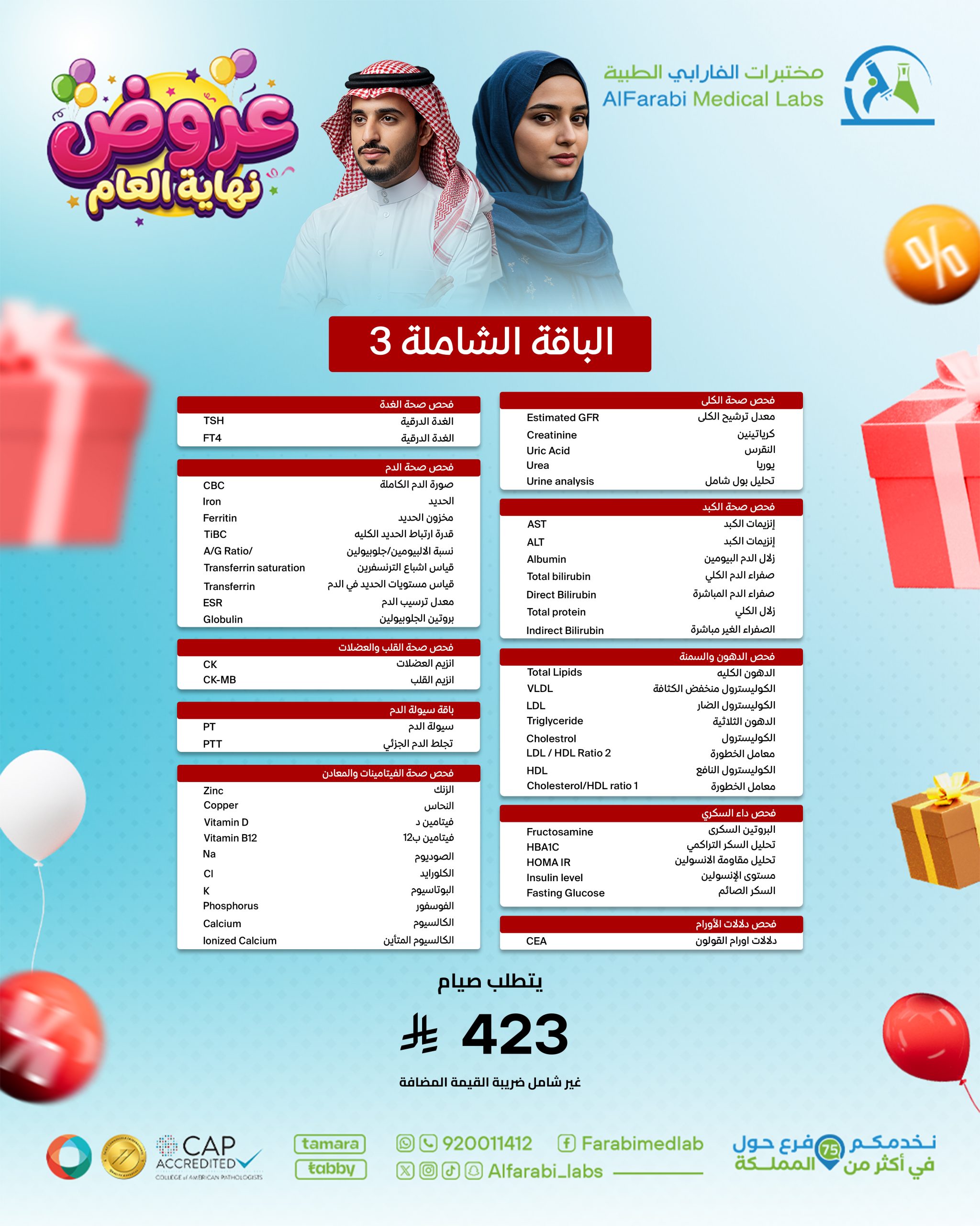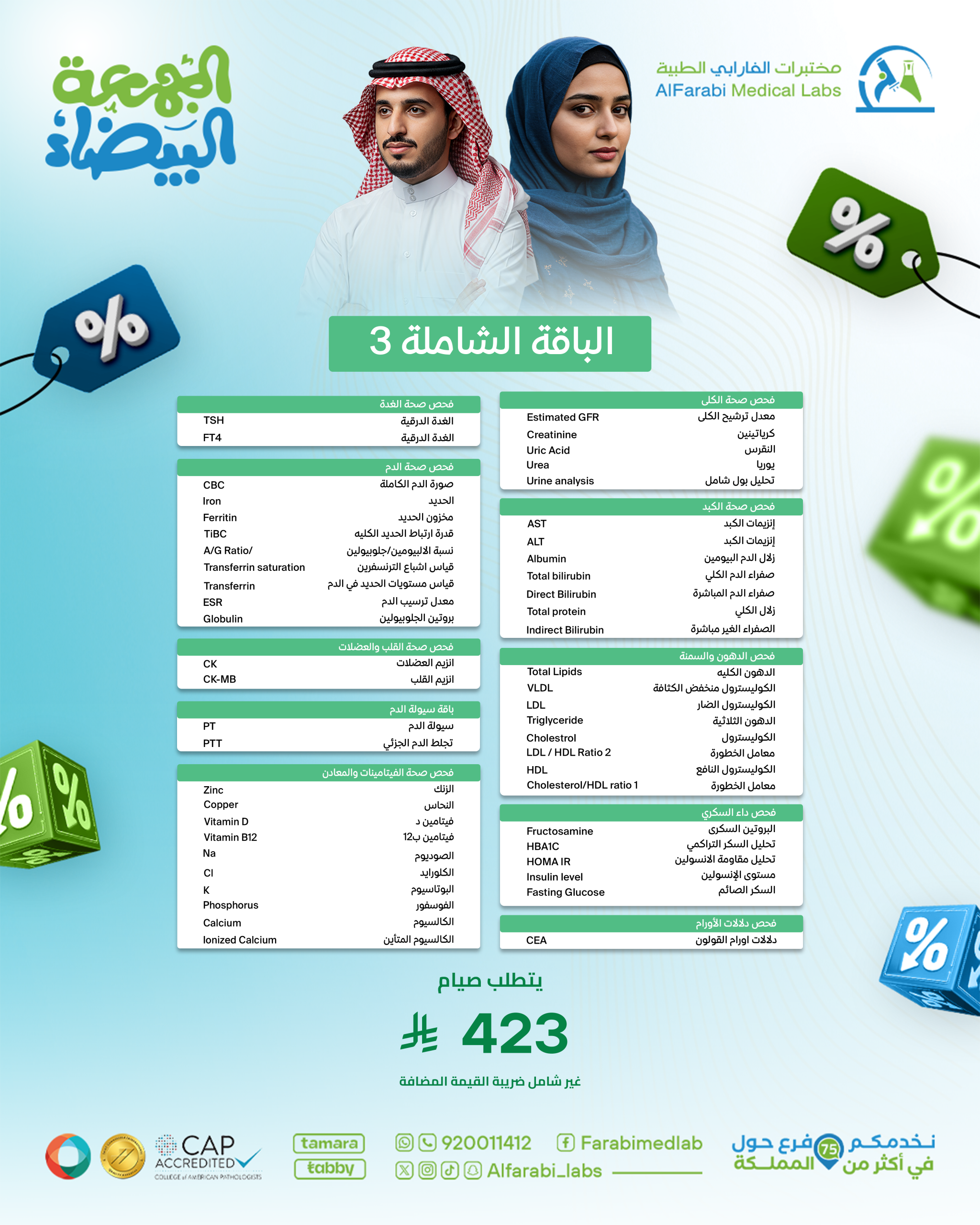 تُعد الباقة الشاملة 3 – الجمعة البيضاء الخيار الأمثل لفحص الصحة العامة للكلى، الكبد، الغدة الدرقية، القلب والعضلات، الدم، الدهون، السكري، الفيتامينات والمعادن، والأورام.